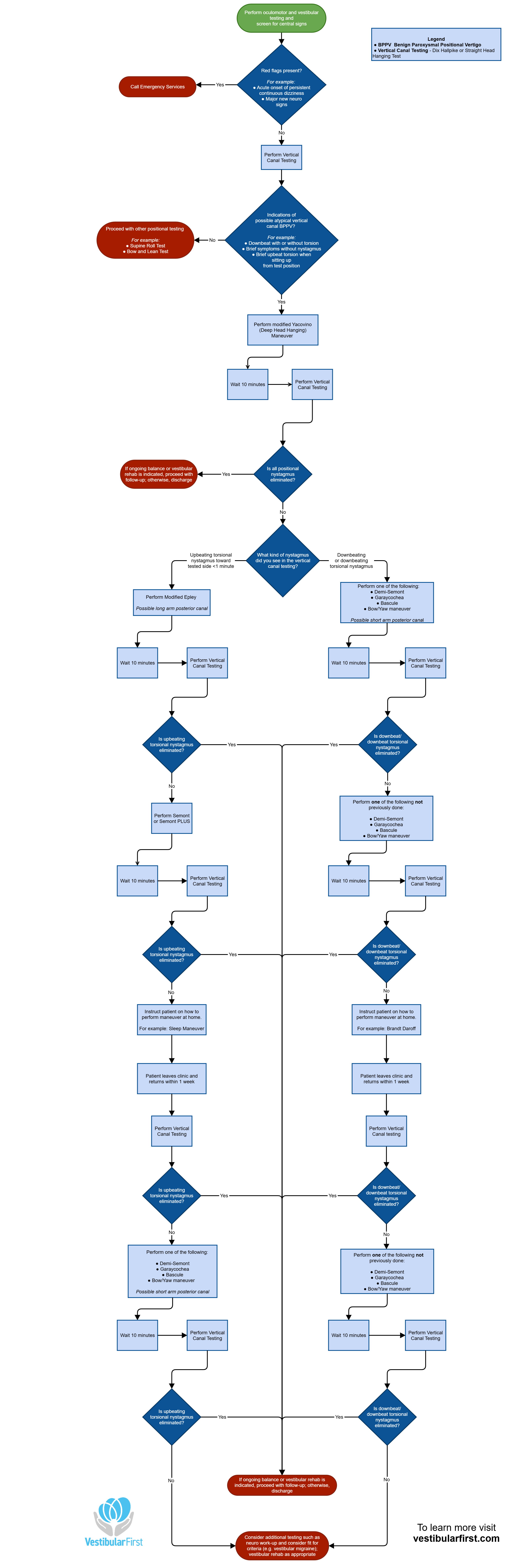This algorithm flowchart outlines a stepwise approach to the evaluation and management of possible atypical vertical canal BPPV, guiding clinicians through differential diagnosis and the selection of appropriate canal-specific treatment maneuvers. This was designed by Vestibular First to help with clinical decision-making.
